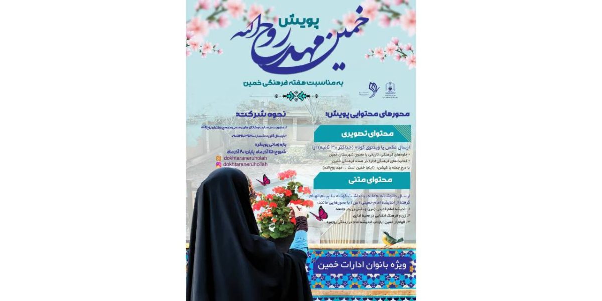 به مناسبت چهارمین دوره هفته فرهنگی خمین (با محوریت بانوان و دختران شاغل در ادارات شهرستان خمین)دعوت می‌کنیم روایت خود را از زادگاه امام خمینی(ره) در قالب متن یا تصویر، با ما به اشتراک بگذارید.